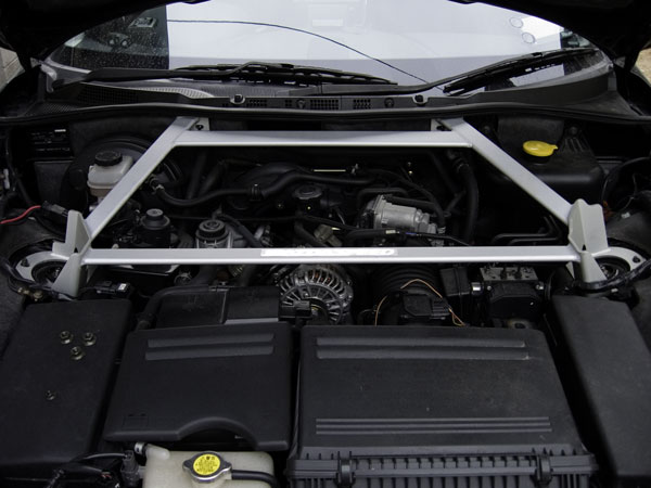 RX-8は標準でフロントにタワーバーが付いており、純正ディーラオプションでフロントの強化型とリヤのマツダスピードバージョンのタワーバーが出ています。両方付けるとどっちがどれだけ効果があるのかよく分からないし標準を強化するより無いところに付ける方が効果は大きかろうとリヤだけ取り付けてみました。