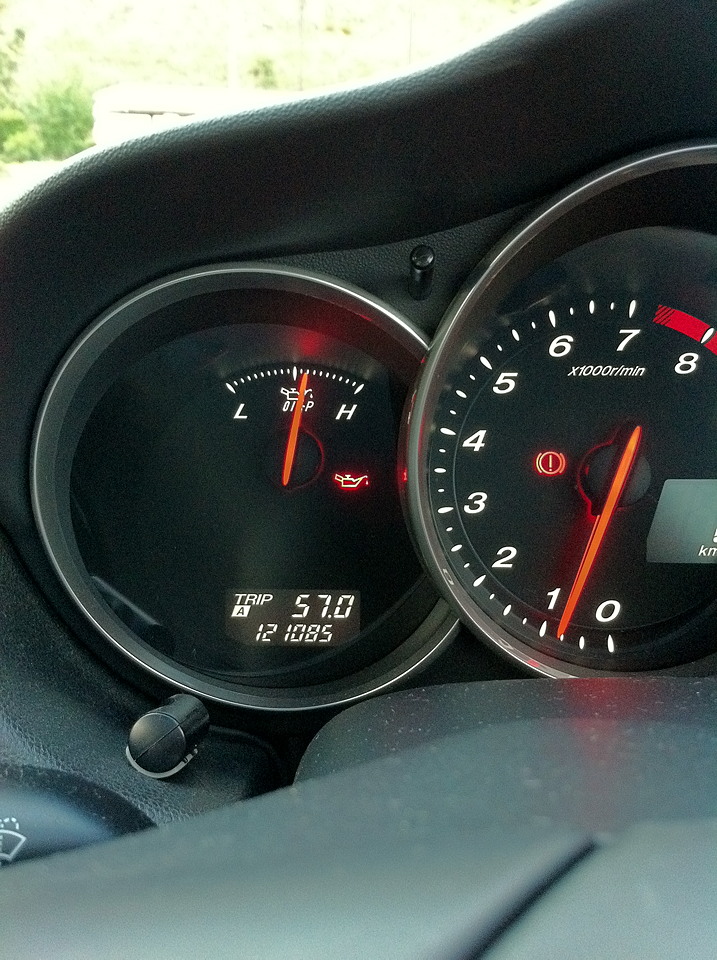 RX-8には標準で油圧計が装備されています。が、機能としては油圧があるかないかの表示しかせずワーニングインジケータと変わりありません。油圧をリニアに表示するとユーザが不安がってしまうのでこうなってしまった様です(水温系も同じ理由から非常に広い不感帯を持っています。他の日本車も大同小異。)。最初期のロードスターに装備されていた油圧計はリニアに油圧を表示していましたがこれを嫌うユーザが多かった為にマイナーチェンジから不動の油圧計になってしまい、RX-8もこれを踏襲したらしく。